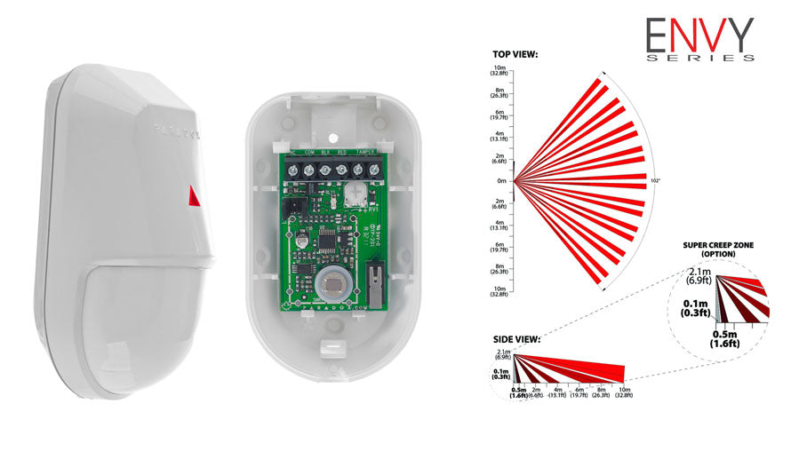 - Paradox's Hybrid Cylindrical-Spherical 1.0 inch lens with 3rd generation 3D Lodiff Fresnel segments- (10 x 10 m (32.8 x 32.8 ft.), 102 degrees viewing angle, and 0.5 m (1.6 ft) to max range (no dead zone beam pattern).